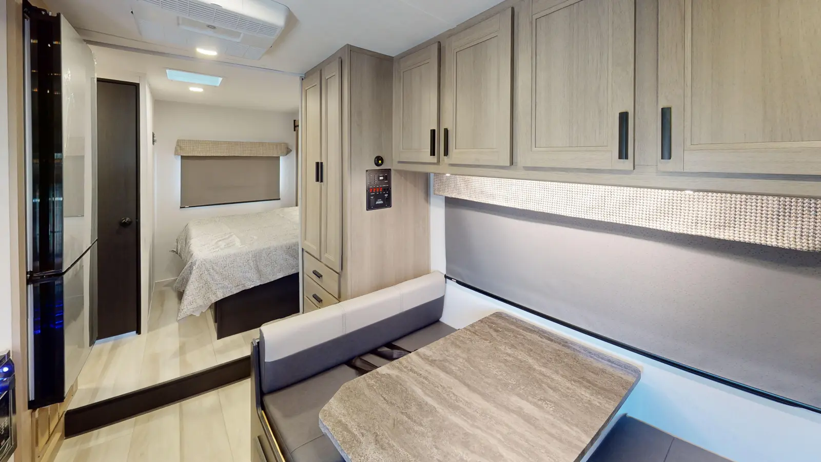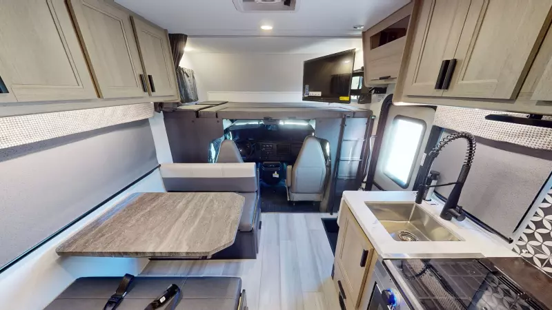 The Forester 2251SLE motorhome is one of the smaller units. This unit features a rear queen bedroom slide for extra privacy. The kitchen area includes sink, convection microwave, 12V residential-style refrigerator, and 3-burner cooktop. Overhead cabinets throughout the coach provide storage options. The rear bathroom gives you a 24" x 32" shower and commode behind the door, with a sink and medicine cabinet that's always accessible. This model is available on either a Ford or Chevrolet chassis.