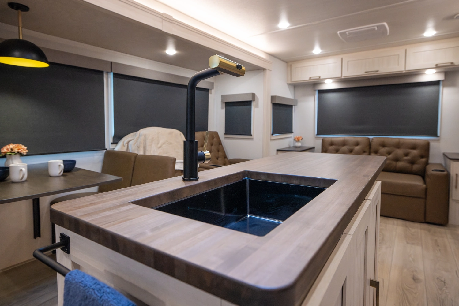 This 38' 10" travel trailer features a front private bedroom with a king bed and ample storage. The rear living area includes a sofa, theater seating, and a fireplace. The kitchen boasts a central island with sink, pantry, and a 10 cu. ft. 12V refrigerator with oven and stovetop. Exterior features include dual electric awnings, outdoor camp kitchen, and a hot & cold spray port.