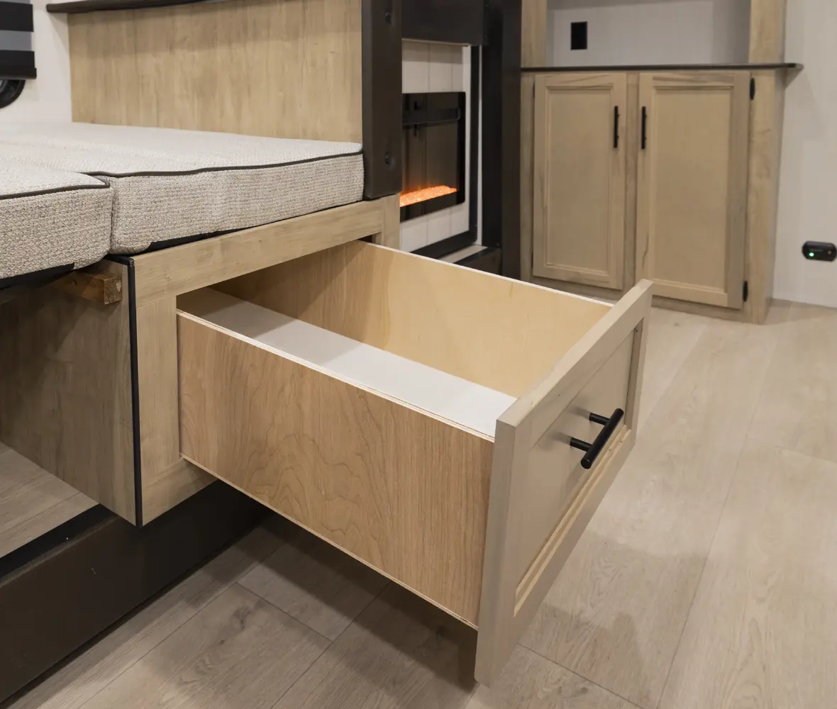 The Cherokee Grey Wolf 26SS by Forest River is a compact yet luxurious travel trailer. Its rear kitchen layout, combined with a large dinette, air fryer combo microwave, 12-volt refrigerator, and ample prep space, makes it perfect for cooking and entertaining. The spacious living area features a convertible sofa for additional sleeping and a hidden pantry for convenient storage. The primary suite, with a king-size bed and ample storage, offers a comfortable and stylish retreat.