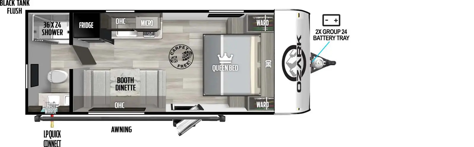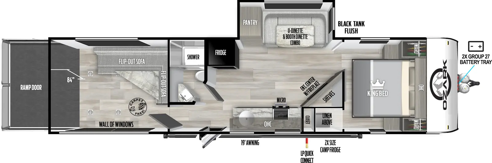 Ozark travel trailers and toy haulers are lightweight, easy to tow, and loaded with standard amenities such as oversized windows, high capacity tanks, and stainless-steel appliances. The unique and spacious floorplans pack in all the features you need and none that you don’t, all while maintaining smooth styling, capability and value. Built with the weekender in mind, all you need to worry about is where adventure will take you next!