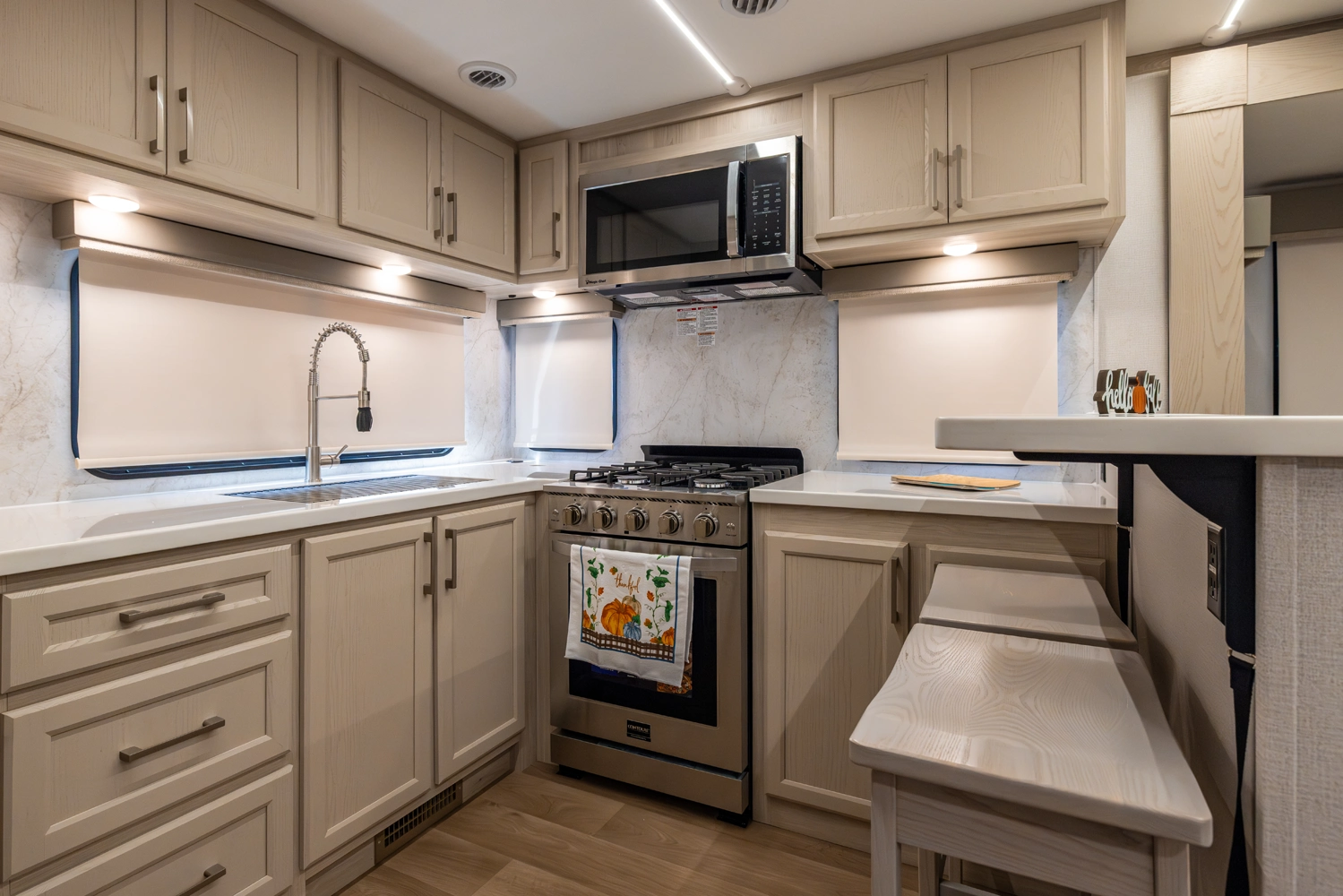 • Stainless Steel Appliance Pkg including 18 cu ft. 12V Refer, 1.7 Cu Ft Microwave and Residential Style 24" Range