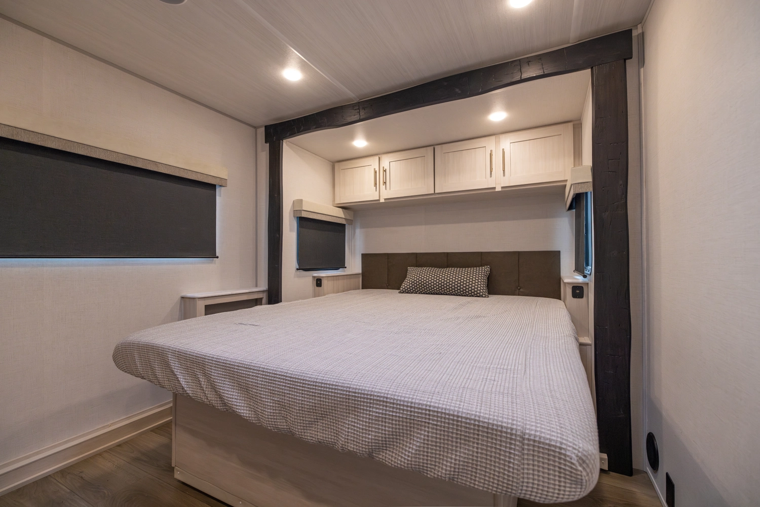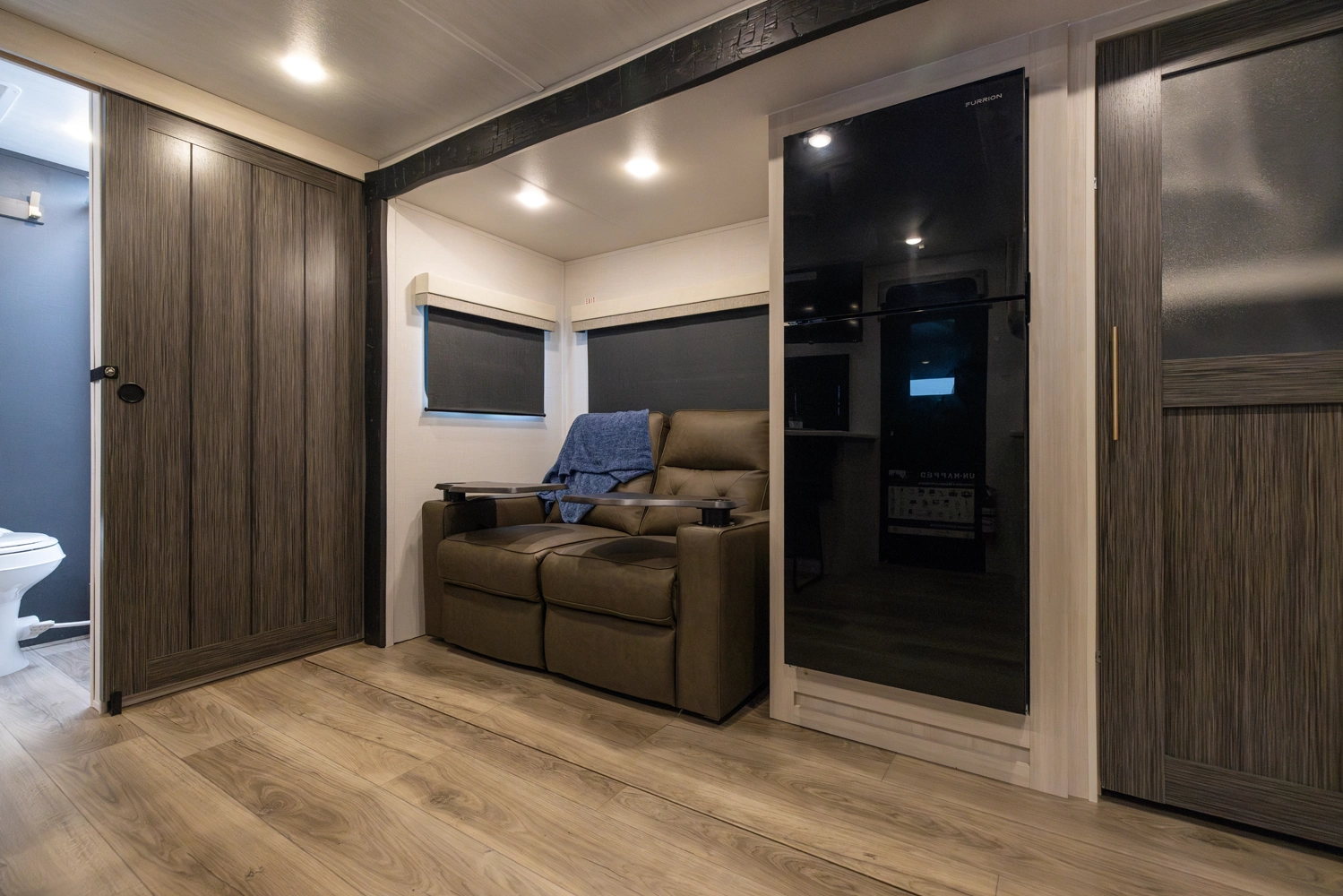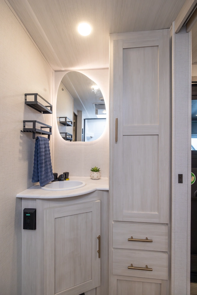 The Un•Mapped 25FK features a front kitchen with a 12V black glass refrigerator and an air fryer microwave. The Bar2Table pull-out dinette and TrailGate outdoor bar enhance dining flexibility and outdoor entertaining. Inside, enjoy a king bed, 15K A/C, and a tankless on-demand water heater. Exterior amenities include a 21' powered awning and a hot & cold spray port.